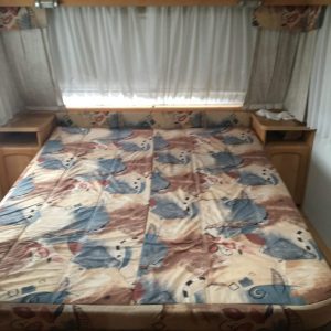 Interieur: lit en long plus couchage d’ appoint ; chauffage gaz air pulsé (très éfficace): eau chaude sur évier et cabinet de toilette avec douchette et wc.