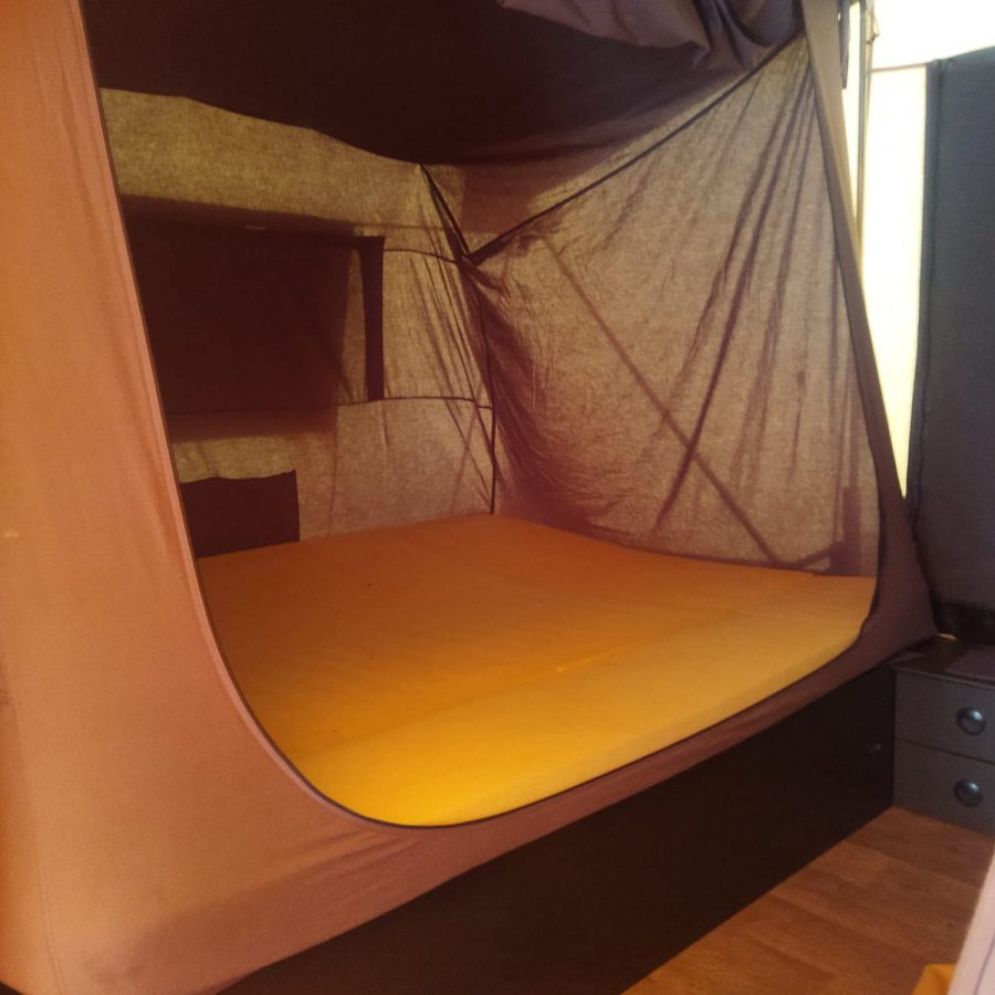 Composée de deux grand lits 210*145 avec sommier et matelas.très grand séjour de 15m2.multiples rangement et sous plateau des lits avec possibilité de créer des couchages supplémentaires d’appoints.
