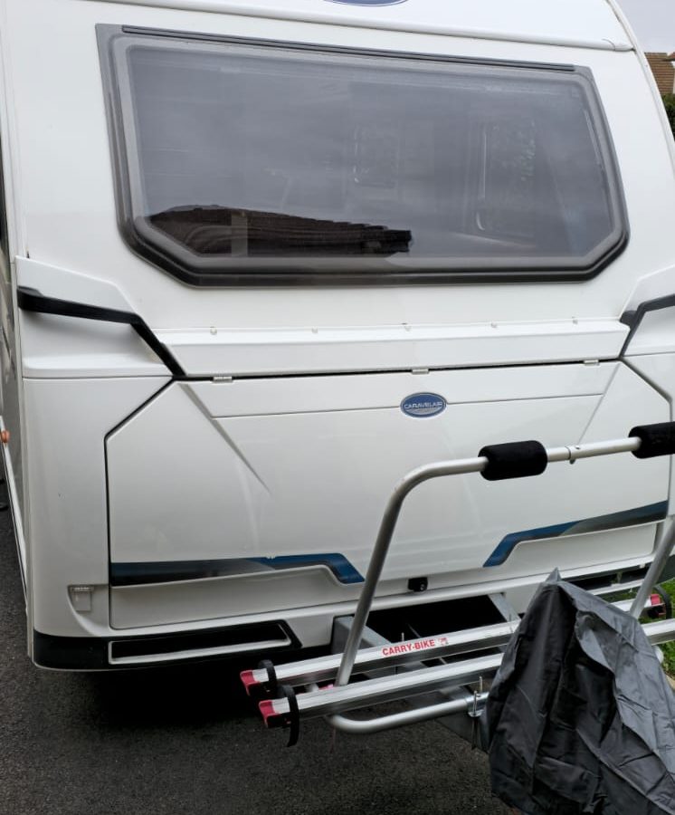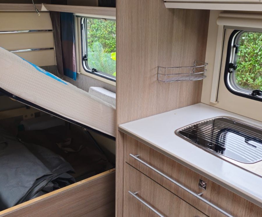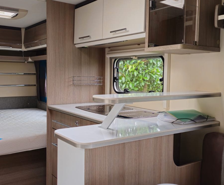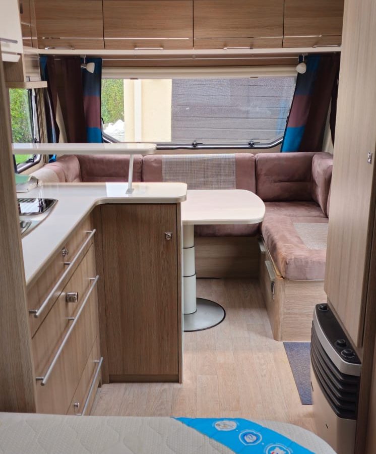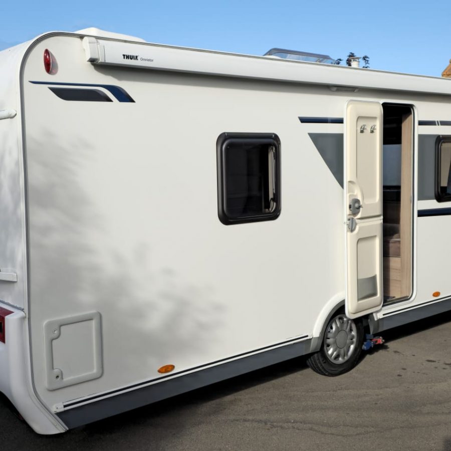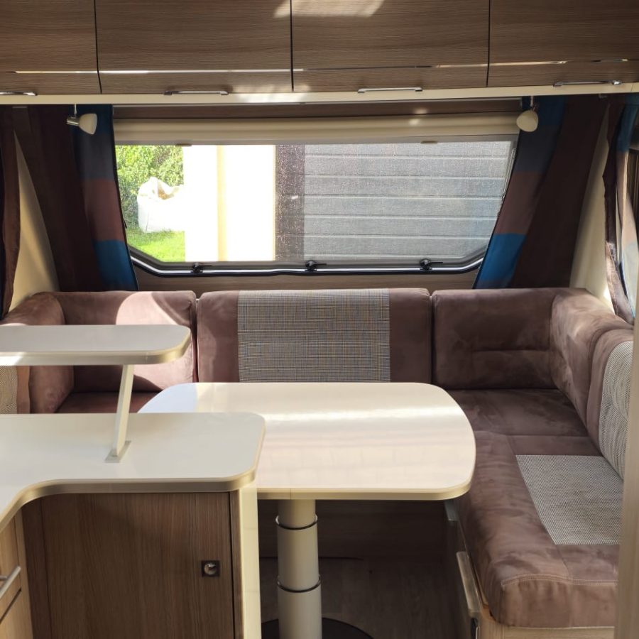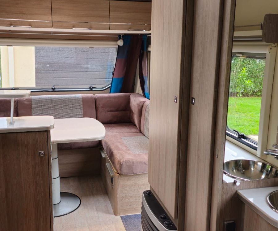 Donne matériel : tapis de sol, auvent Trigano Océan 2,50×5,77, marche-pied, housse caravane, table, chaises, meuble de cuisine, vaisselle…