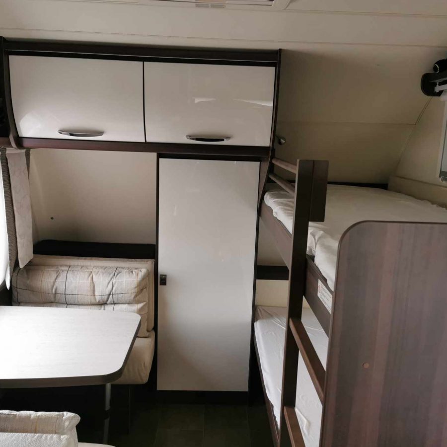Longueur extérieur (hors flèche ) 6,13 mètres. Grande modularité offrant 6 à 7 couchages, idéale pour famille. 1 lit pavillon 2 places . 2 couchettes fixes superposées. Salon transformable en couchages pour deux places. Dînette avant transformable en lit une personne. Cuisine équipée avec évier. Plan de cuisson 3 feux jamais utilisé. Nous n’avons jamais cuisiné à l’intérieur de la caravane. Réfrigérateur de 104 litres. Rideau de séparation entre les deux espaces couchage. De très nombreux rangement.