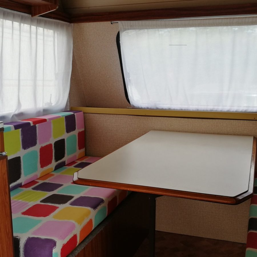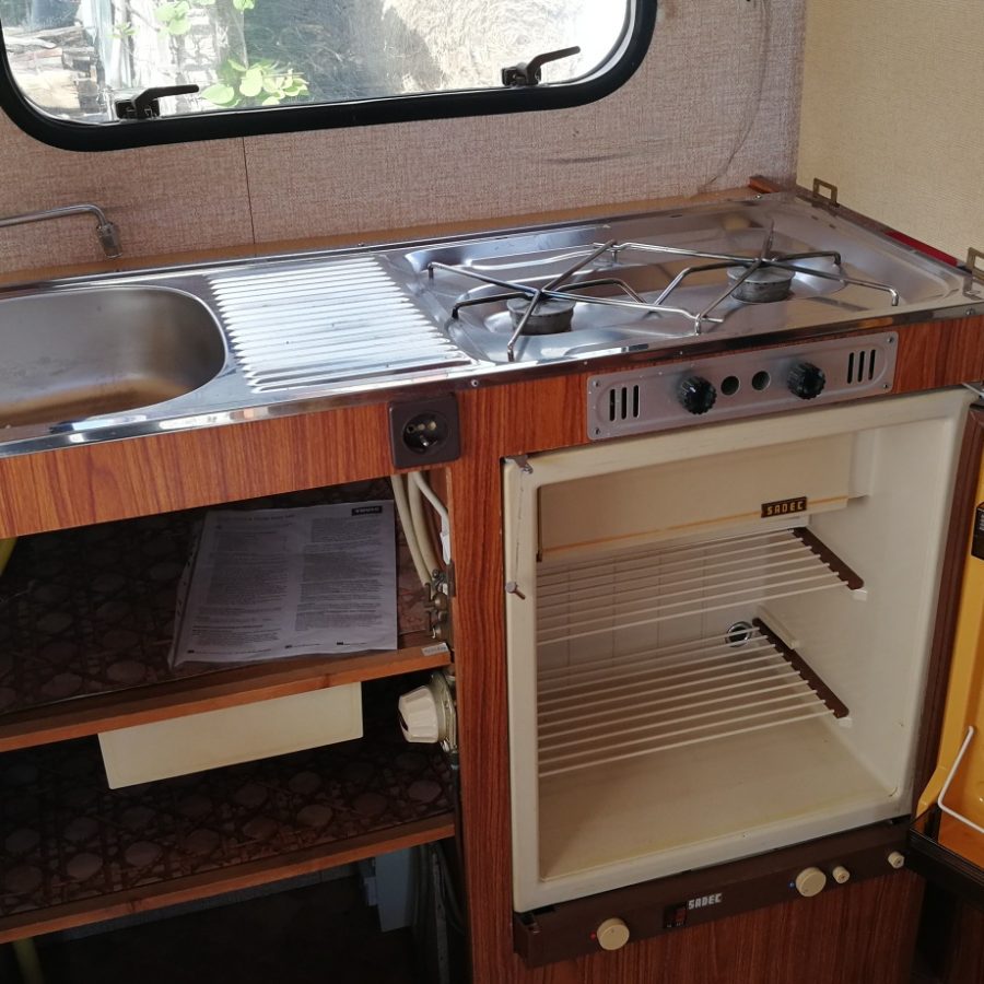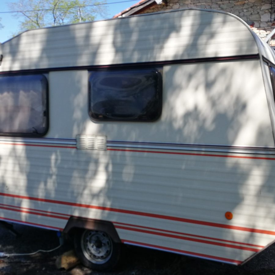 Caravane de 1985 en bon état générale, 3 places avec évier, 2 feux, frigo, Auvent, pneu neuf + pneu de secours, rétroviseurs, électricité à revoir