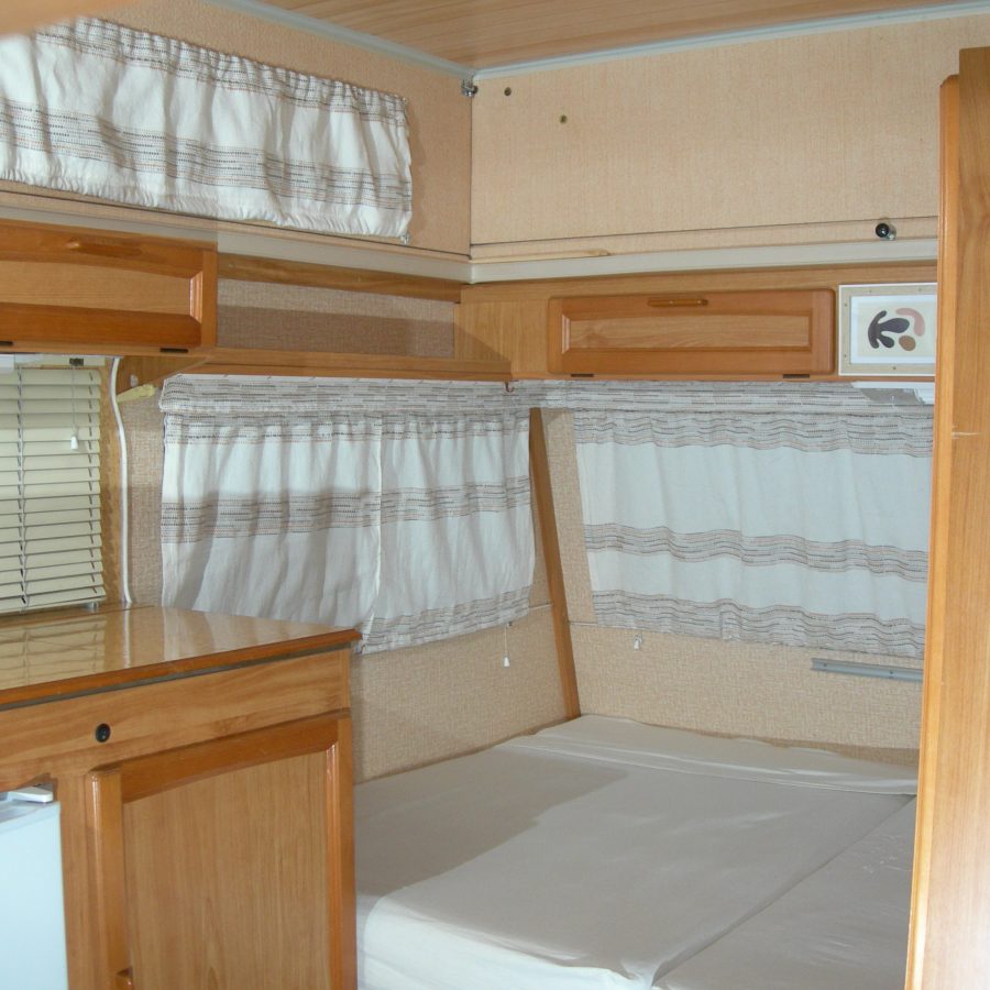 ( petite caravane surbaissée / mini caravane surbaissée avec 3 couchages et 4 ème couchage spécial optionnel : + 195 euros. Photos du couchage optionnel sur demande ).