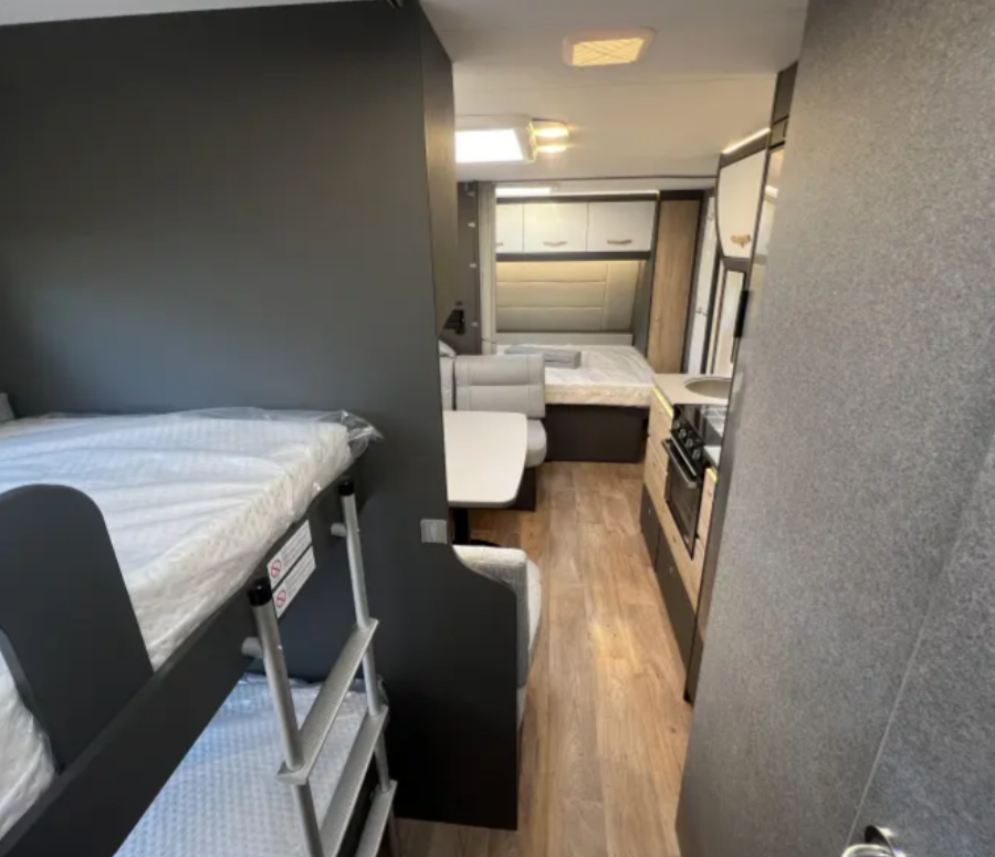 Superbe et spacieuse caravane 4 saisons, 1 espace parents avec 1 lit tout confort, 1 espace enfants avec 2 lits superposés avec usb et lampe individuelle ainsi que l’espace transformable en grand lit.