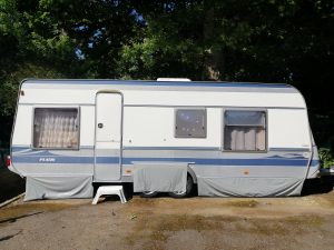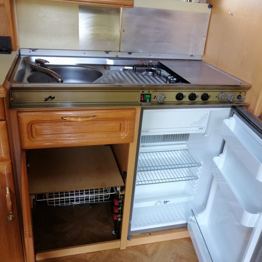 séjour/salle à manger, chambre avec placard, salle de bain avec douche, coin cuisine (réfrigérateur, plaque de cuisson, évier), entrée avec placard, chauffage, chauffe eau, climatisation, 4 pneus neufs.