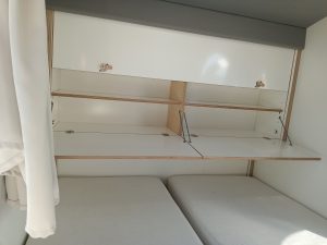 Rangements intérieurs , électricité sur batterie avec 2 prises 220 V, prises USB, éclairage intérieur, possibilité de branchement d’un chauffage portatif