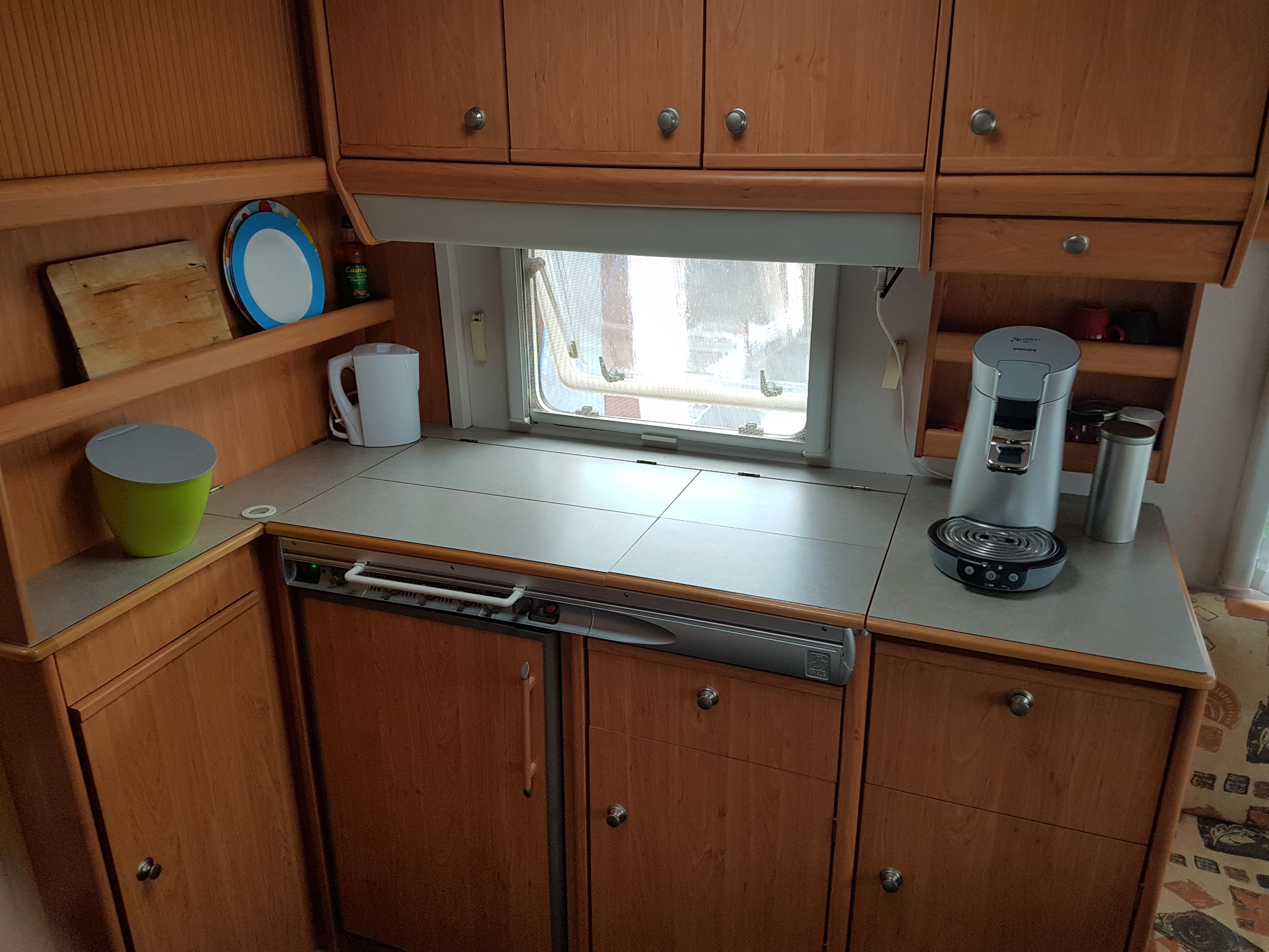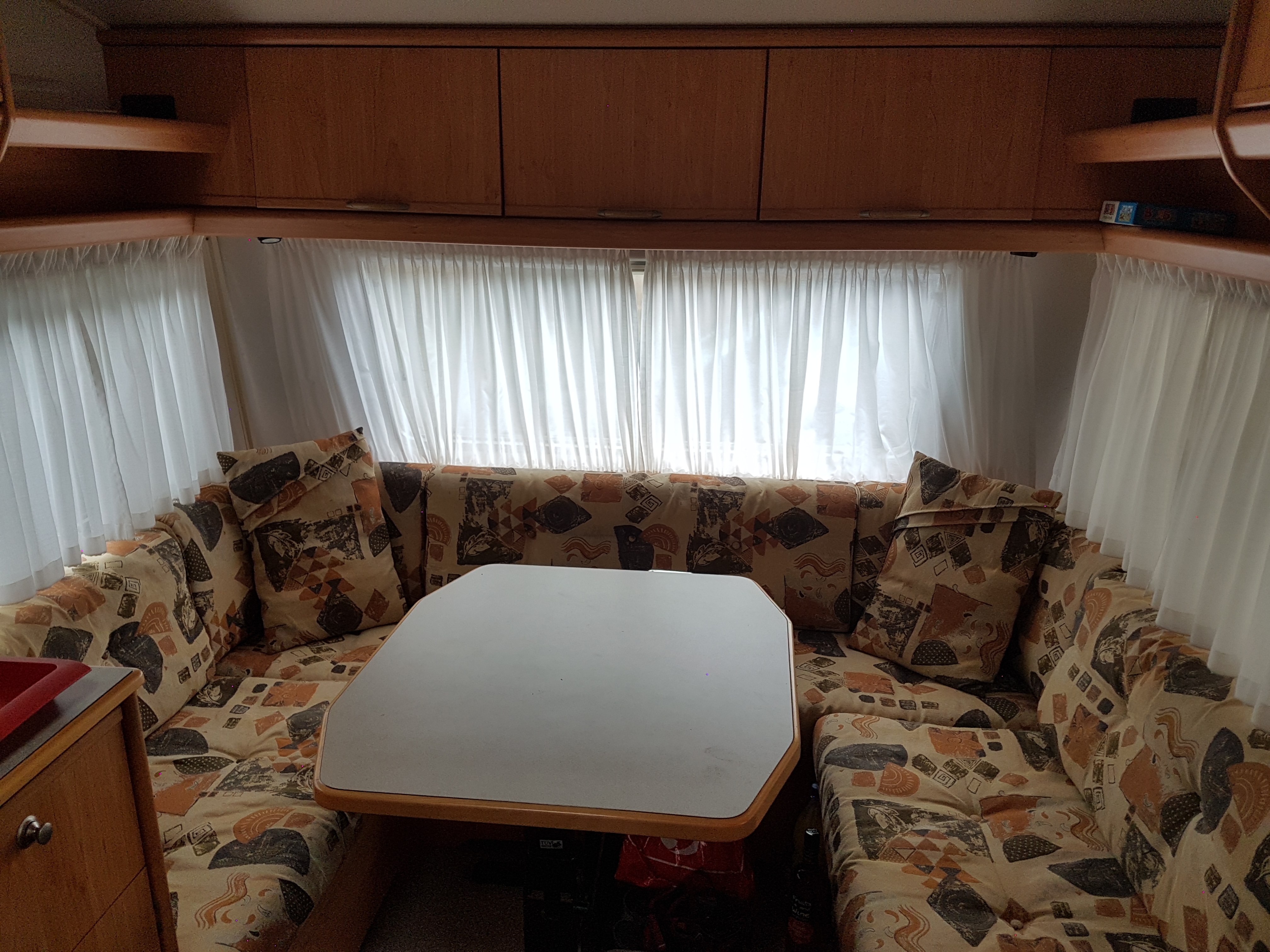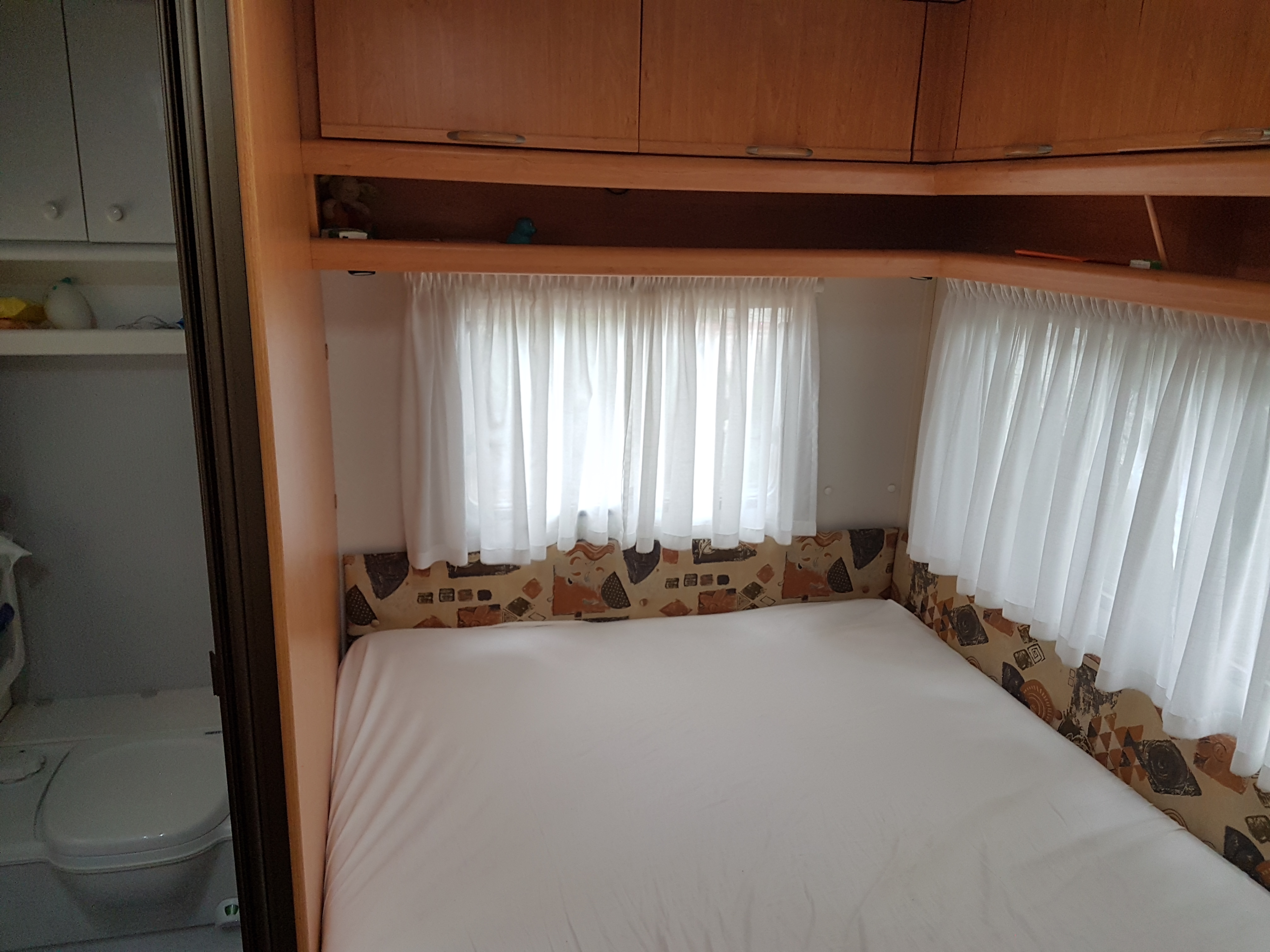 disposition : entrée sur kitchenette équipée, frigo, nombreux rangements dont meuble TV, à l’arrière chambre avec lit à la française, 2 personnes (1,98 x 1,40 m), WC, lave main et rangement, grande penderie, et à l’avant banquette arrondie coin salon convertible lit 2 places (2,11 x 1,38 m) et nombreux rangements.