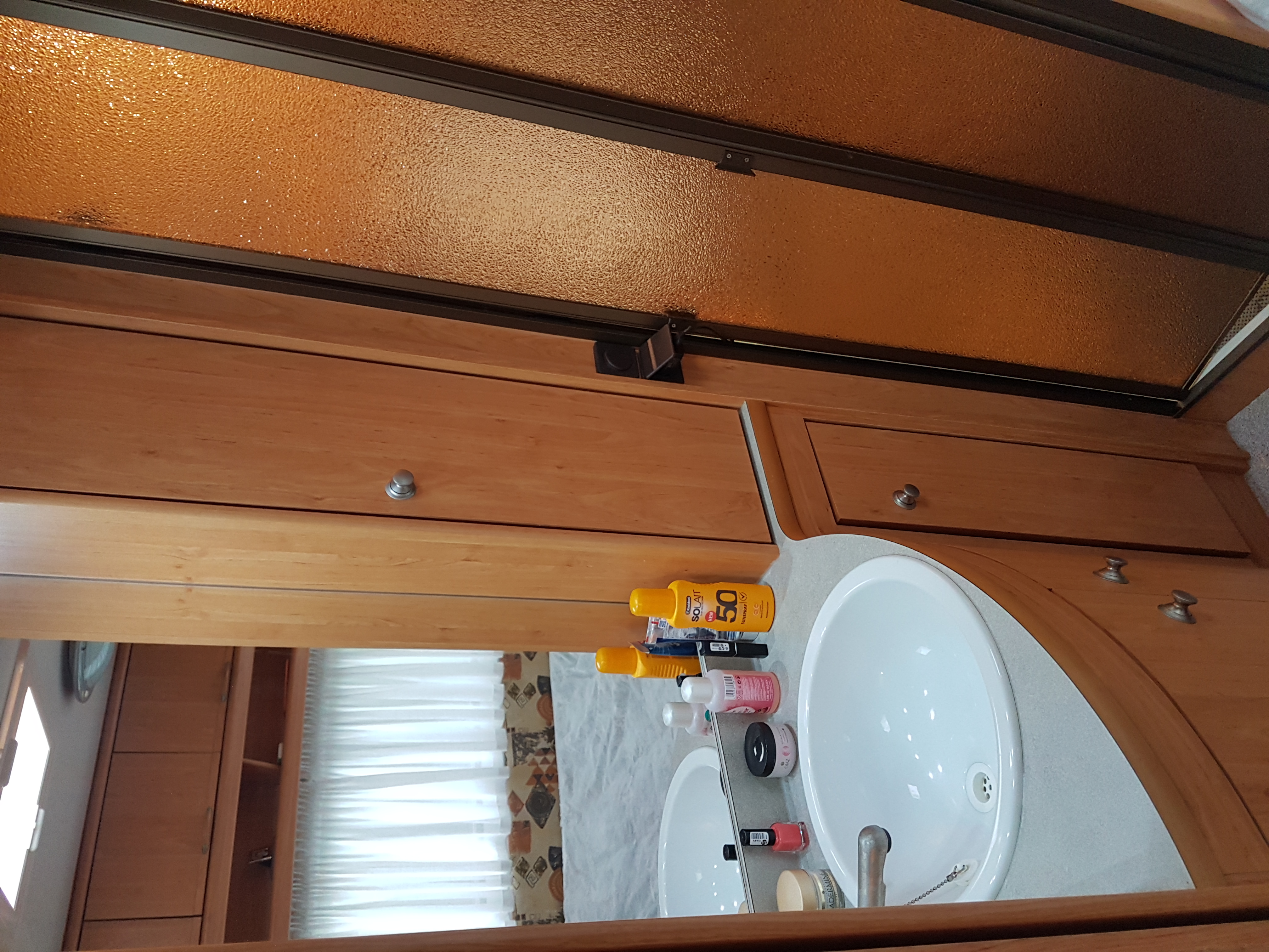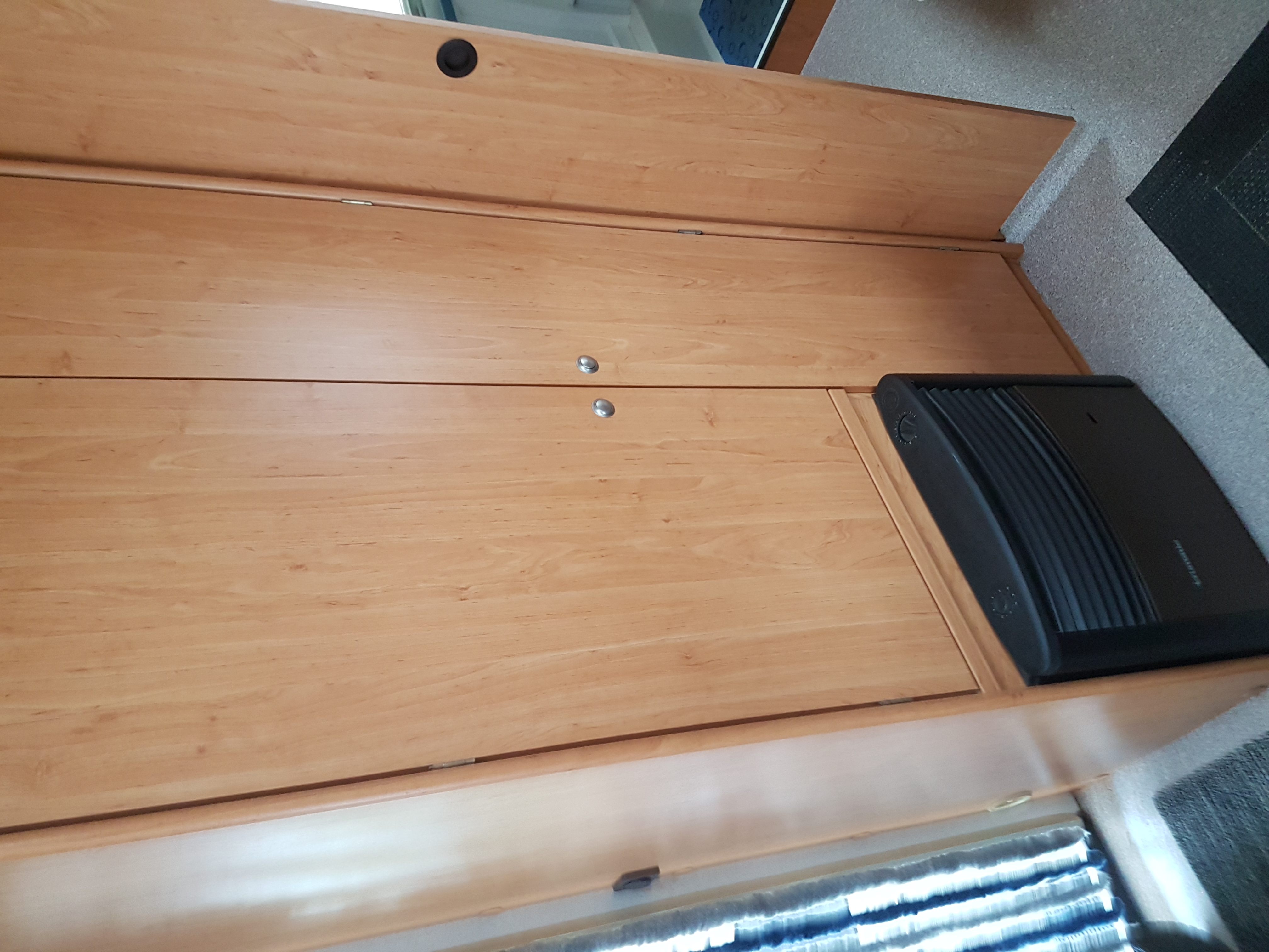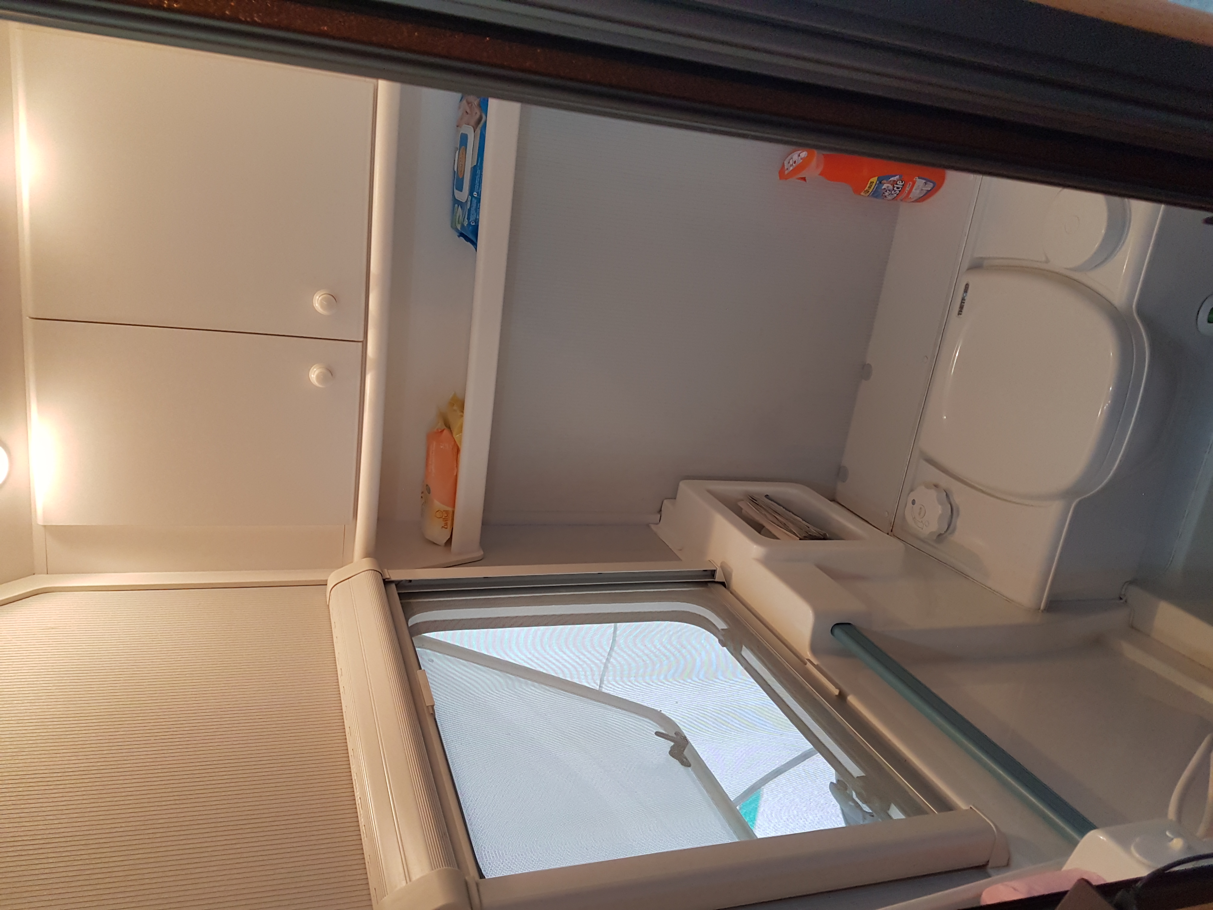 disposition : entrée sur kitchenette équipée, frigo, nombreux rangements dont meuble TV, à l’arrière chambre avec lit à la française, 2 personnes (1,98 x 1,40 m), WC, lave main et rangement, grande penderie, et à l’avant banquette arrondie coin salon convertible lit 2 places (2,11 x 1,38 m) et nombreux rangements.