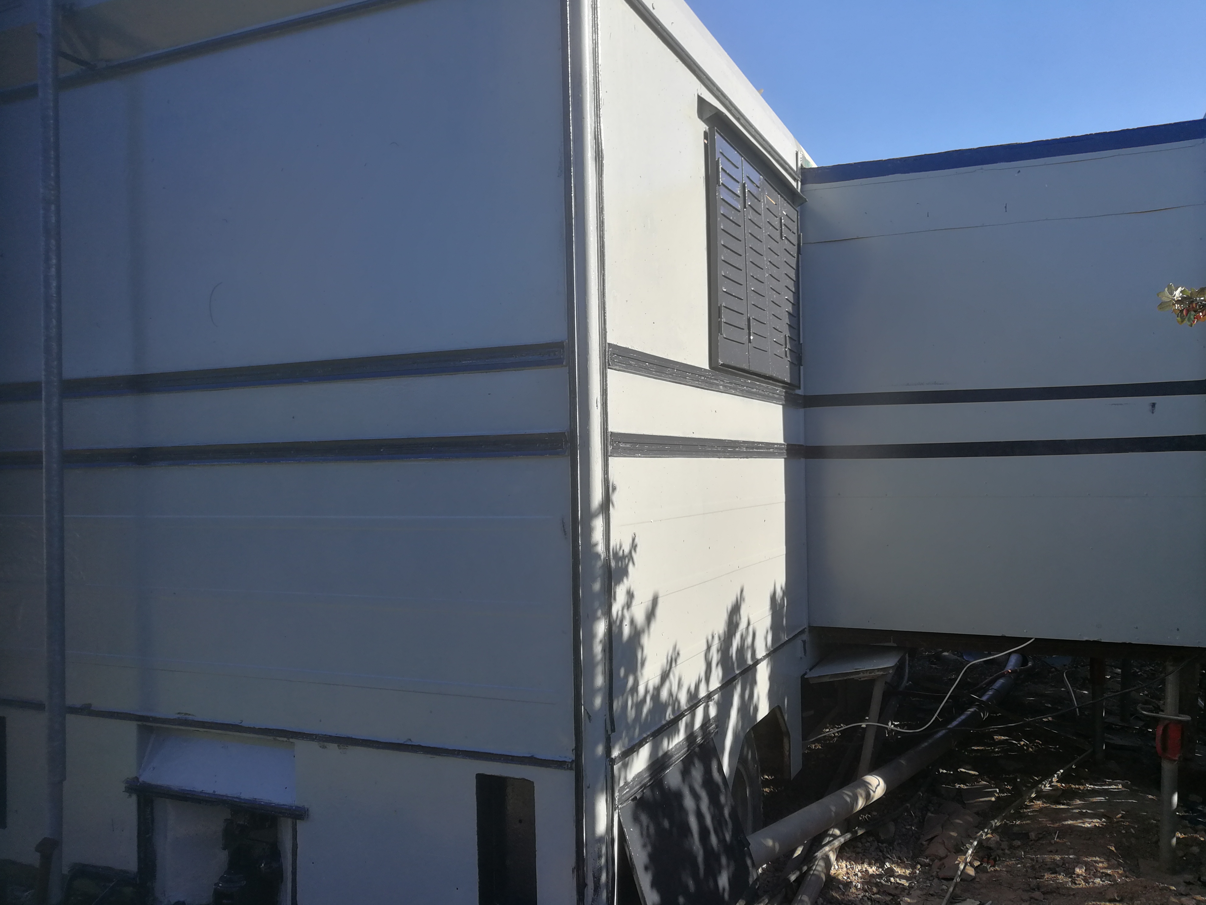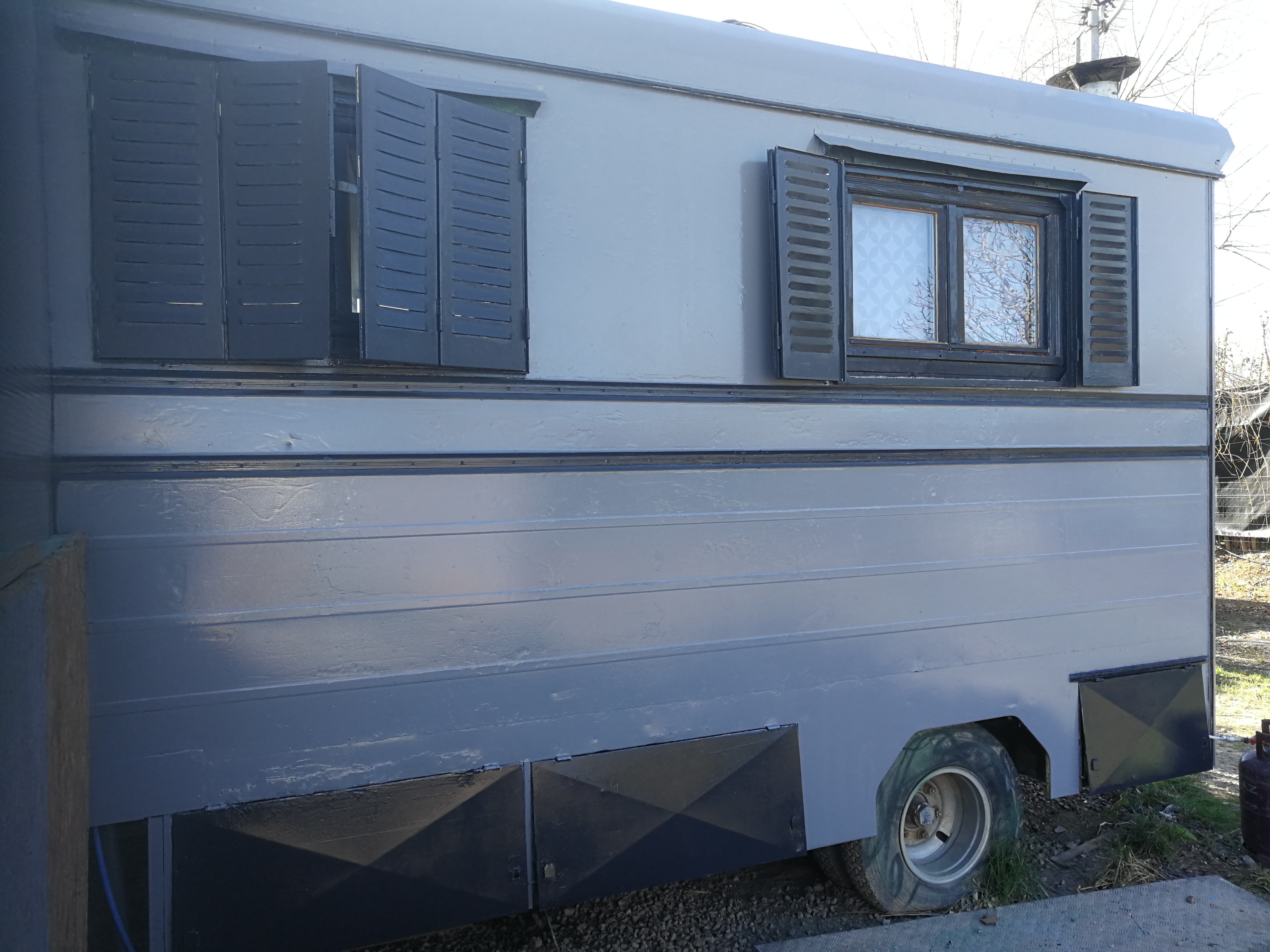 Caravane foraine Laurent, rallonge latérale de 3m sur 1m60, environ 30 m2 en tout. Année 50 / 60, en tôle galva très saine, entièrement restaurée en 2020,.