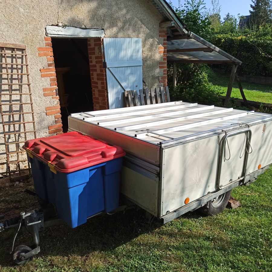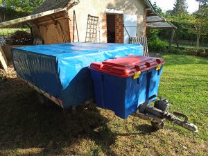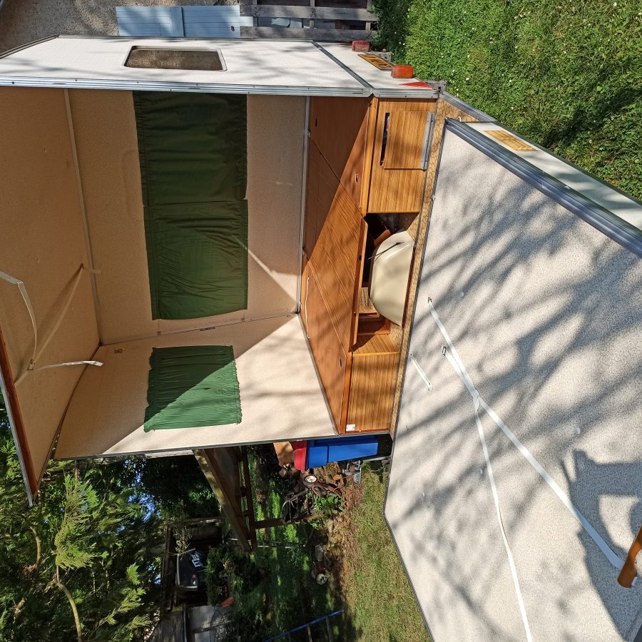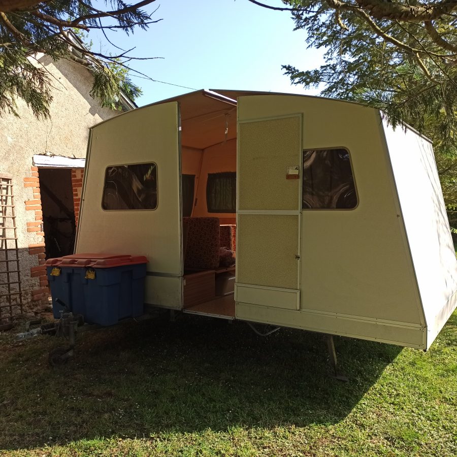 Look et tissus très « vintage ». Bon état, facile à déplacer et tracter. Avec avancée en toile et porte vélo « maison » si souhaité.