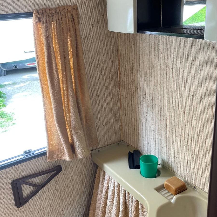 Il y a également une salle d’eau avec un lavabo, et des rangements.