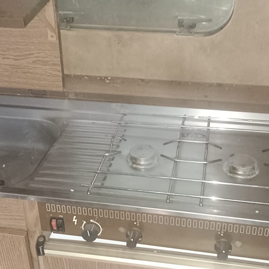 La cuisine est complète : évier, gazinière 2 feux, frigo en place.